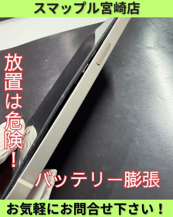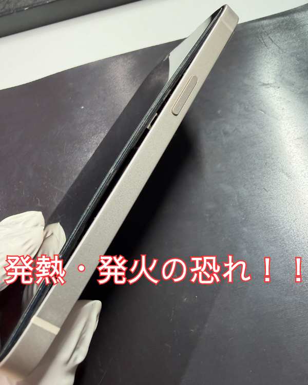 原因はバッテリーの劣化による膨張です。このまま放置すると画面の破損、発熱や発火の危険もあるため早めの交換が大切です。