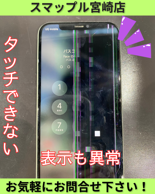ガラスが割れていなくてもこのような表示異常やタッチが一部分だけできないといった症状も起こります。