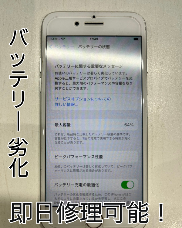 iPhone7は発売からかなりの年数が経っているためバッテリーの劣化が進んでいる端末が多いです。「充電の減りが早い」という症状はバッテリー交換でスッキリ改善します。今回は実際にご来店いただいたiPhone7のバッテリー交換です。