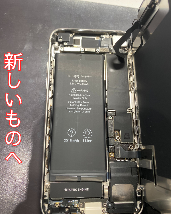 iPhoneSE3は画面側を開けてバッテリー交換を行っていきます。ホームボタンがあるのでケーブルを切らないように気を付けながら画面を開けます。古いバッテリーを外して新しいバッテリーを付けてバッテリー交換完了です。作業前と作業後の動作確認も含めバッテリー交換30分で完了です。作業前も作業後も動作確認問題なし。データもそのまま。バッテリー交換した当日は十分に充電することをお伝えしお返ししました。