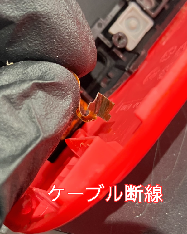 今回持ち込まれたJoy-Conは右側で充電ができないとの事で修理依頼にご来店されました。Switch本体にJoy-Conをつけて確認したところ反応すらありませんでした。Joy-Conレールの不具合の可能性があるので分解していきます。中を開けて見てみると落としたのか、プラスチックのつめの部分と思われるかけらがポロポロとでてきました。そしてケーブルが切れていることを確認しました。