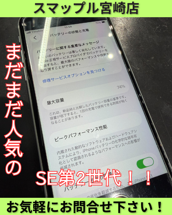 iPhoneSEの第2世代はコンパクトで使いやすく今でも愛用者の多い機種です。発売から年数が経っているためバッテリーの劣化を実感される方も多くみられます。