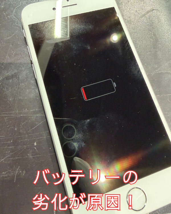 画面上には赤いバッテリー残量表示が出ており、一見すると充電自体はできているように見える状態でした。しかし、しばらく充電してもバッテリー残量は増えず、そのまま電源が落ちてしまうとのことでした。この症状は充電器やケーブルの不具合と勘違いされやすいですが、実は本体内部のバッテリー劣化が原因となっているケースが多く見られます。