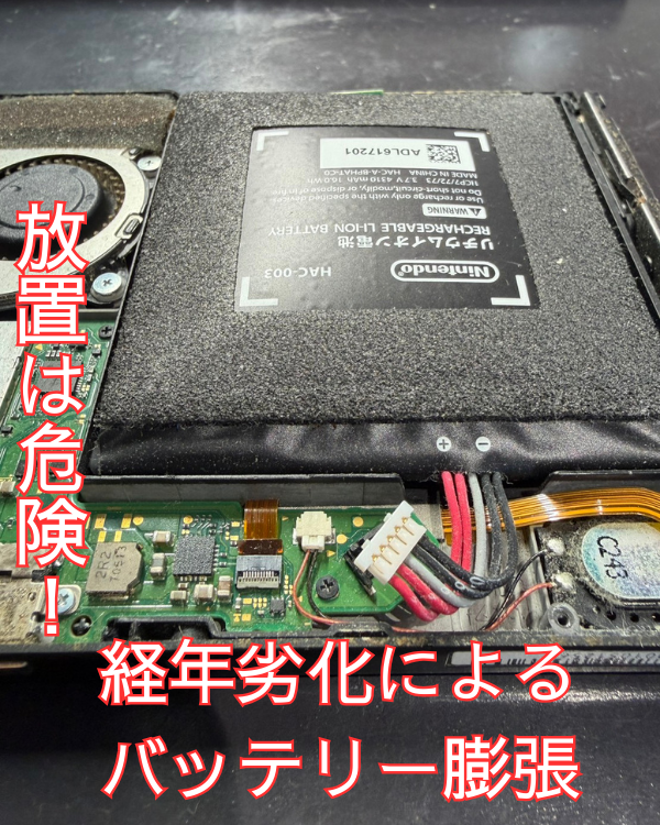 Switchを分解して内部を確認するとバッテリーが通常よりも膨らんでおりフレーム等に負荷がかかっている状態でした。
