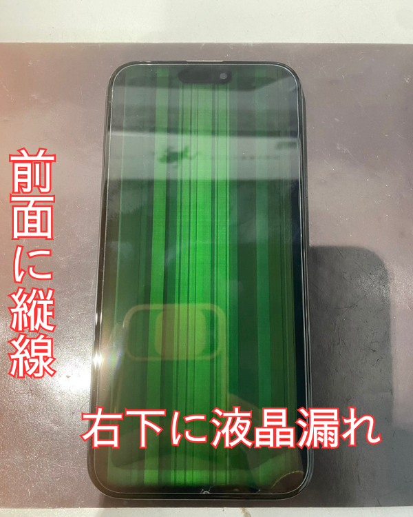 今回持ち込まれた端末はiPhone15ProMaxの画面に緑と黒い線が縦に入っており右下に液晶漏れが確認されました。表示異常が全面に出ており全く操作出来ない状態でした。スマホが使えない状態でとてもお困りの様子でした。音はなるので画面の不具合だけと判断し画面の修理をしていきます。
