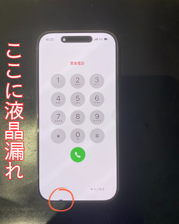 今回持ち込まれた端末はiPhone16Pro。左下に少しだけ液晶漏れが確認できます。今回持ち込まれた時には縦線の表示異常は見られませんでしたがお話によるとたまに液晶漏れのところから縦線が出たり消えたりするとの事でした。たったこれだけの液晶漏れでも画面に異常をきたしている為、放置することは危険です。早めに修理へお持ち頂いたので誤作動やブラックアウトは免れそうです。