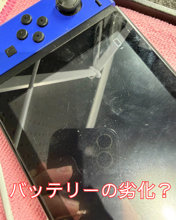 お預かり時のSwitchは充電器を挿すと画面右上に充電アイコンが表示されるが充電がたまらずすぐ電源が落ちてしまう状態でした。この症状はバッテリーが劣化しきっている場合によく見られます。Switchは使用年数が長くなると充電を挿しっぱなしや長時間の連続プレイなどによって、バッテリーの劣化を感じることが多くなります。