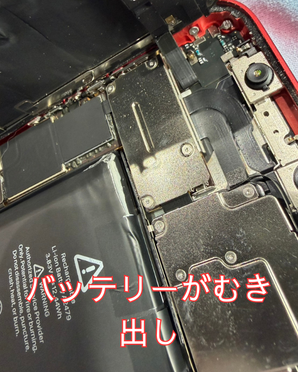 iPhone12は発売から年数も経ちバッテリーの経年劣化が進んでいます。今回の端末みたいにバッテリーがむき出しになっている場合かなり危険です!特にニオイが出ている場合も要注意です。この状態で使用を続けると発熱、発煙、最悪の場合は発火に繋がるリスクもゼロではありません。まだ使えるからと言ってそのまま放置も危険です。